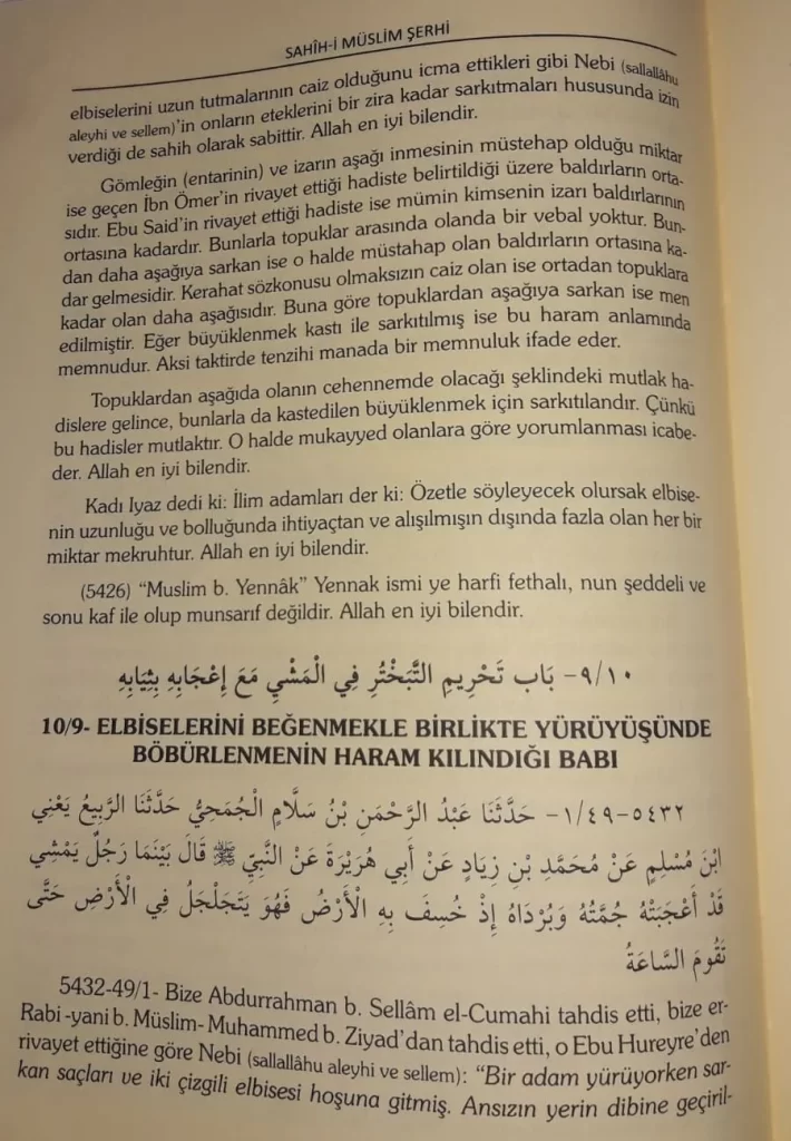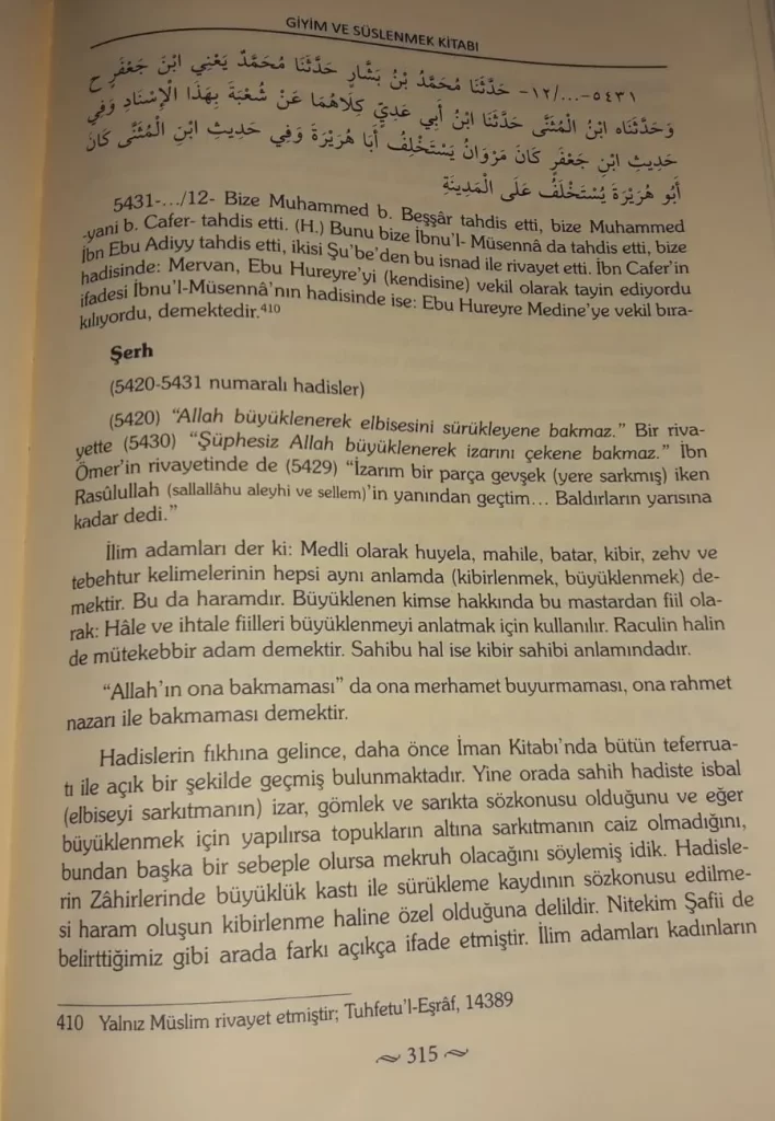 Buharî ve Müslim’de geçen şu hadis bütün bunlara delalet etmektedir: “Kim kibir kastıyla elbisesini uzatırsa kıyamet gününde yüce Allah onun yüzüne bakmaz.” [503] Rasulullah sallallahu aleyhi ve sellem uzun giyilen elbisenin hükmünü kibirlenmek için giyilmiş olması şartına bağlamıştır. Bu da Buharî’nin şu hadisinde kastedilenin bu olduğunu gösteriyor: “Ayak topuklarından aşağıda olan izâr (sahibi) cehennemdedir.” [504] Çünkü mutlak olan ki bu son hadistir- mukayyet olana -ki bir önceki hadistir- hamledilir. Müçtehit imamlar bu meseleden bahsederken bunu açıklamışlardır.